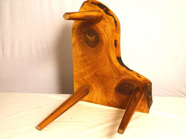 Auf drei Beinen stehts sich besser: extravaganter Ecktisch aus edlem Nußbaumholz, mit Waldkante und achteckigen Beinen, kunstvoll gezapft und verkeilt.
